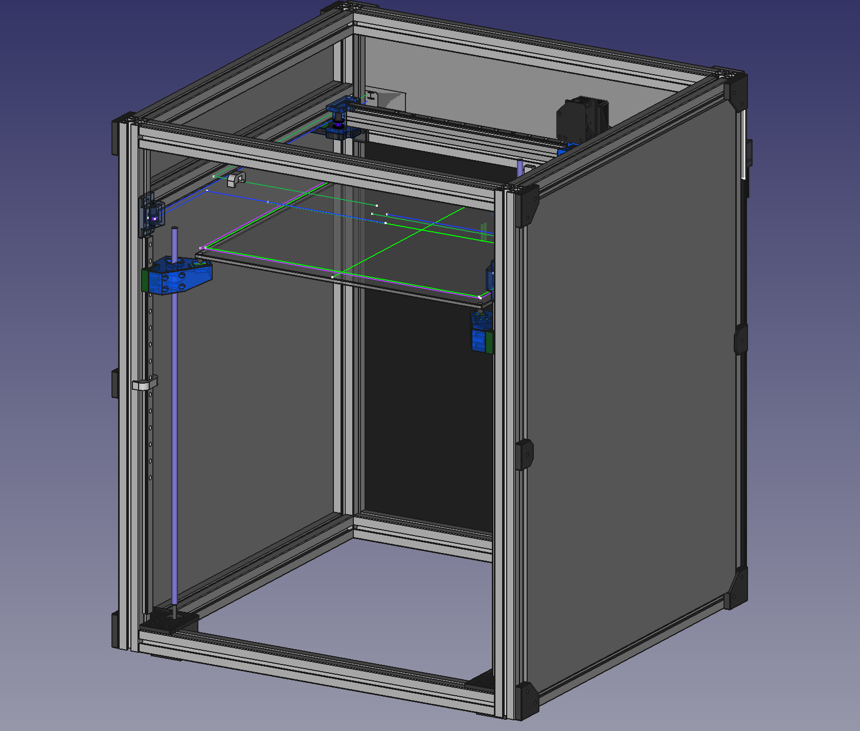 상단 인클로저는 목표 단가에 들어오게 하기 위해서 프로파일을 안 쓰고 조립물과 플라베니아 패널로만 조립되는 형식으로 했다. 플라베니아가 다 좋은데 꽤 낭창거리기 때문에 이게 문제였다.