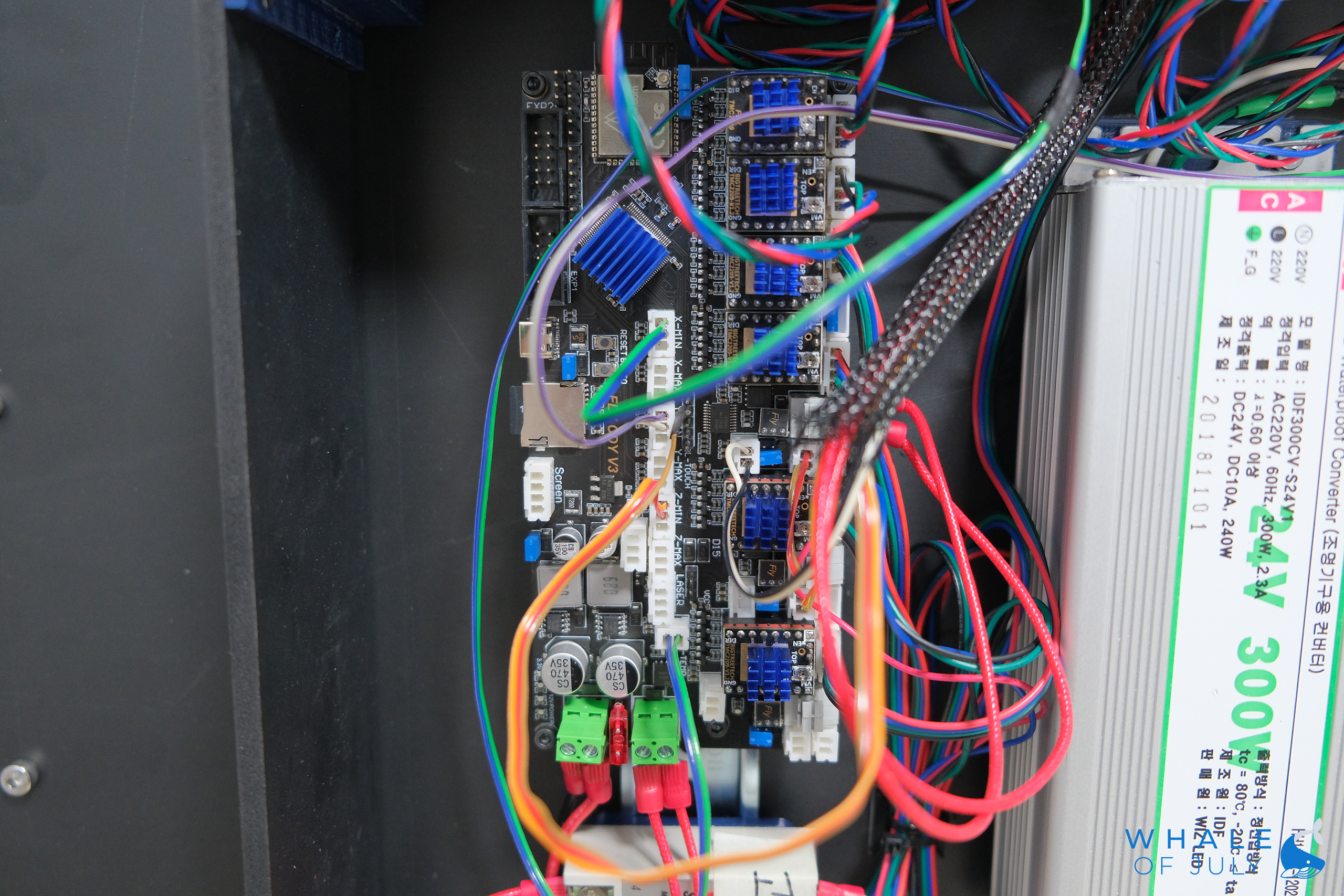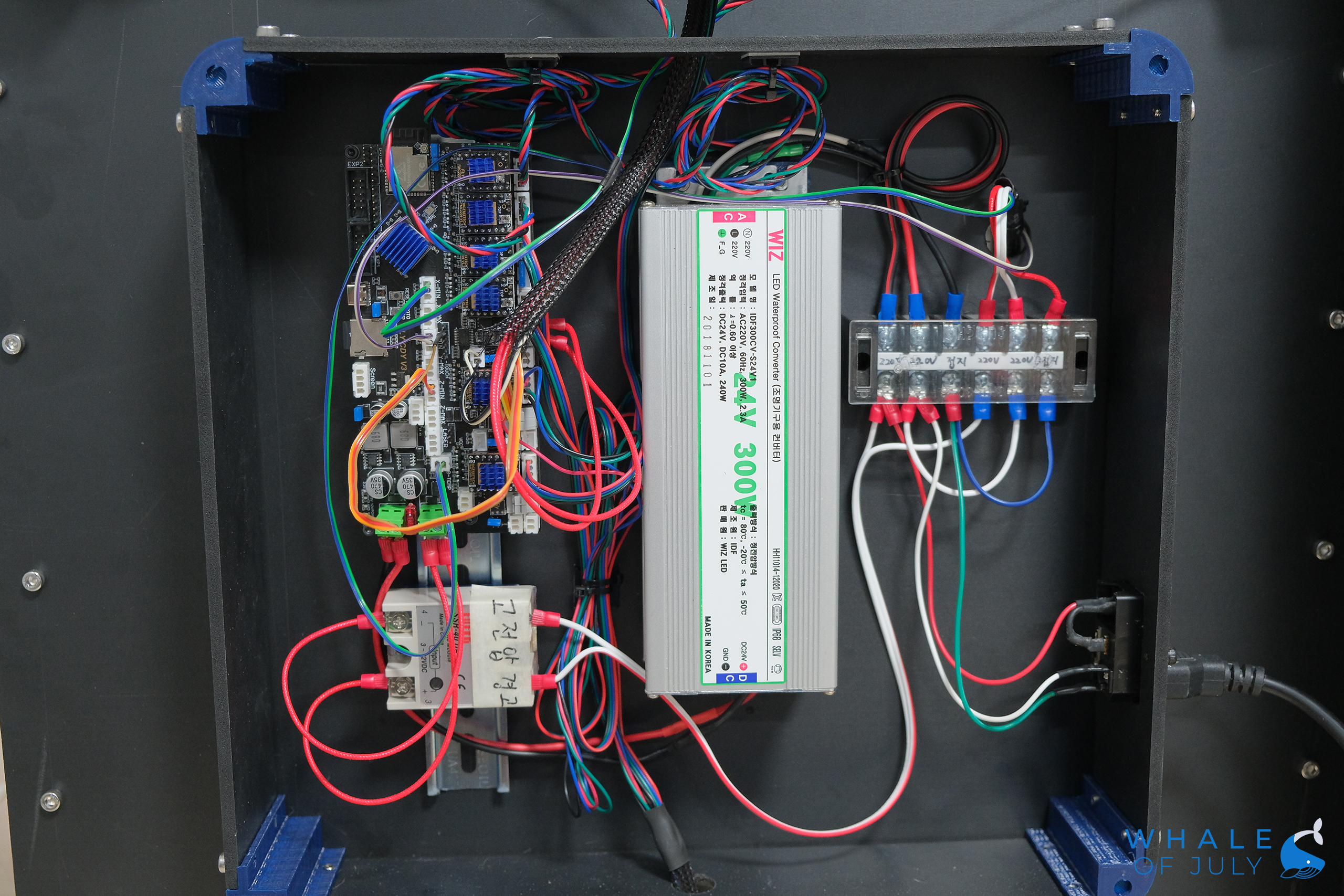 전자부 하우징 조립하는 과정이 빠졌는데 별건 없고 포맥스랑 출력물 코너 브래킷이랑 조립한 다음 프린터 백패널에 조립했다.